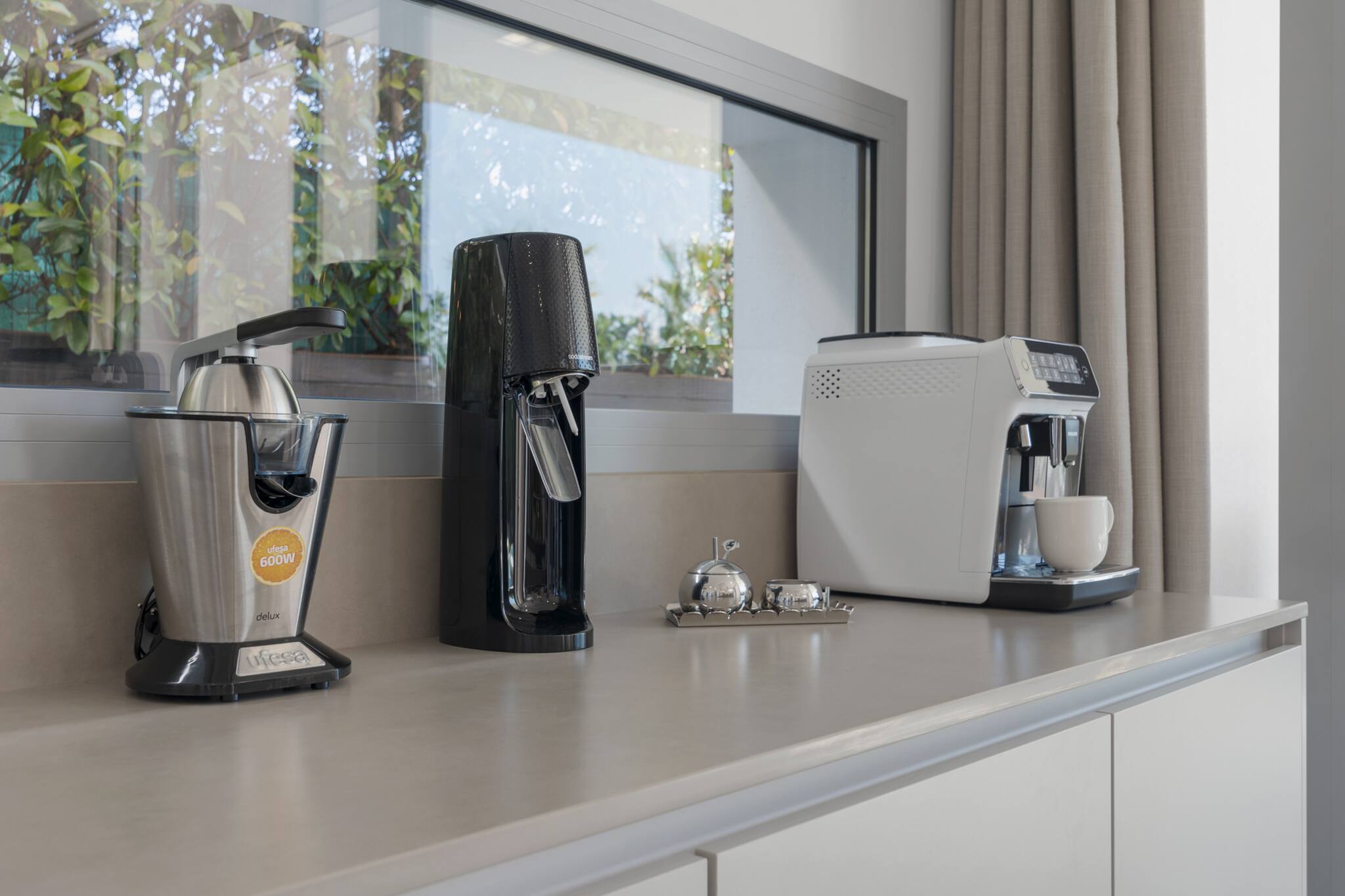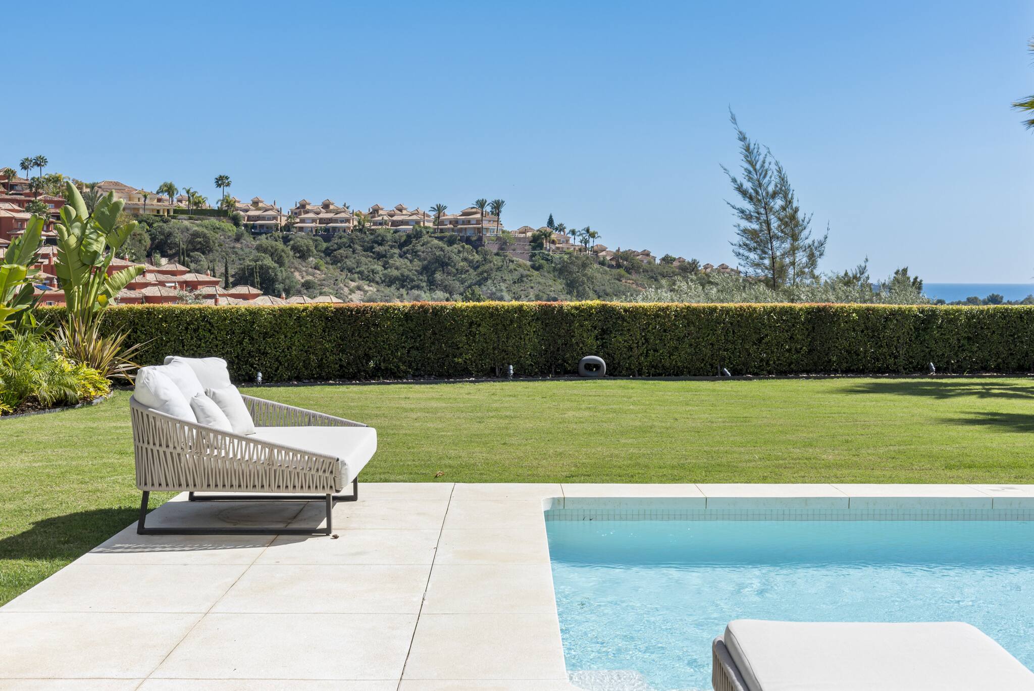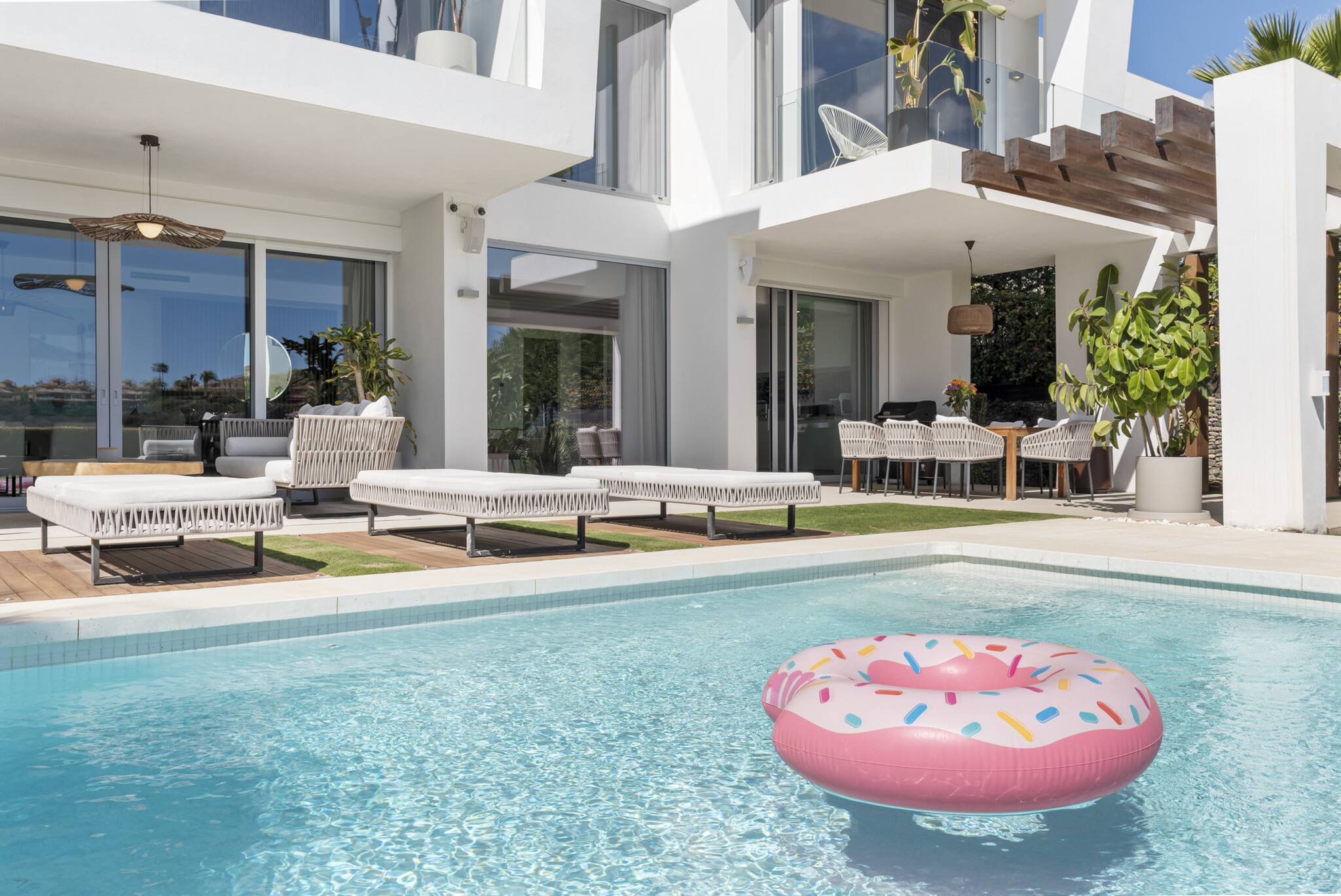 Tilbyder have, terrasse, vaskemaskine, grill, strygejern, internet (wifi), hårtørrer, alarm, aircondition, swimming pool privat, utildækket parkering til den samme bygning, TV.