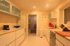 Det køkken med keramiske kogeplader, med service og køleskab, mikroovn, ovn, fryser, opvaskemaskine, tallerkener/bestik, køkkenredskaber, kaffemaskine, brødrister, kedel og saftpresser.