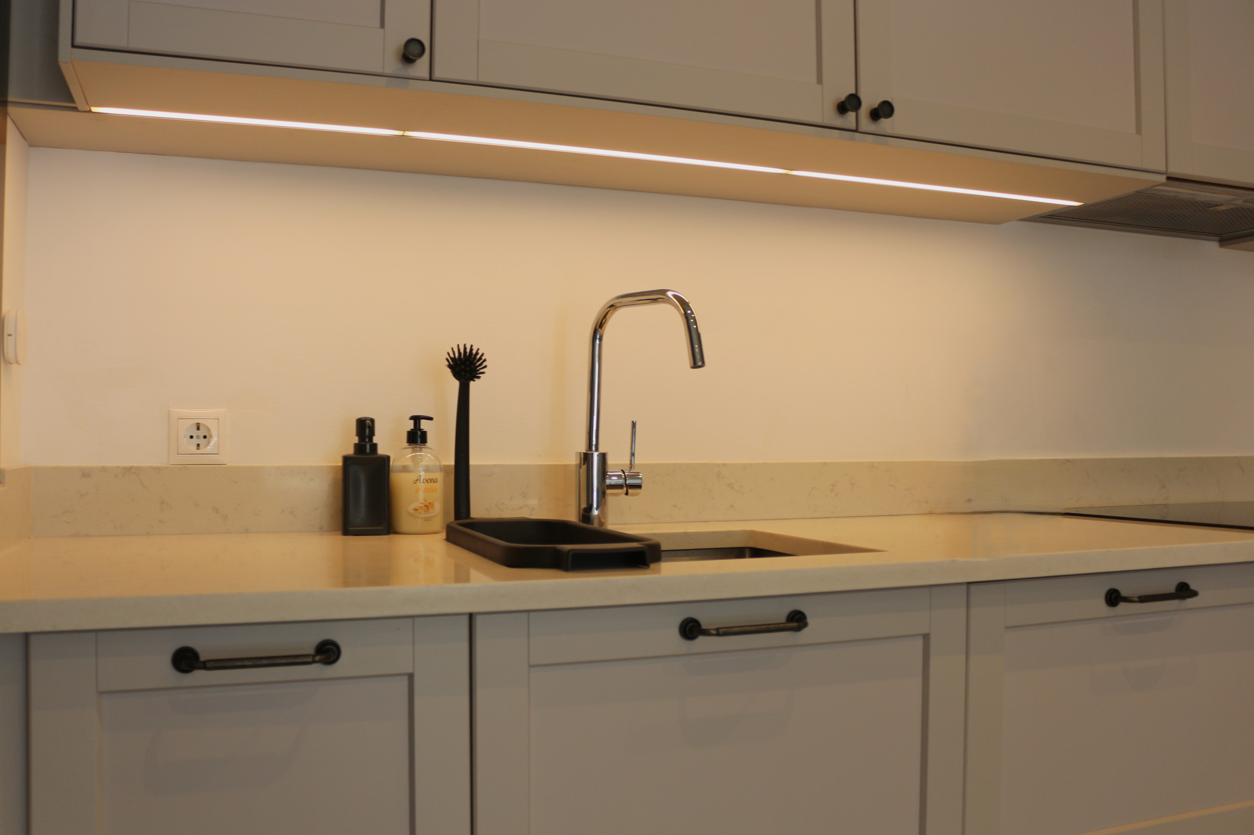 Een volledig uitgeruste keuken met vaatwasser, oven, magnetron, koelkast en wasmachine