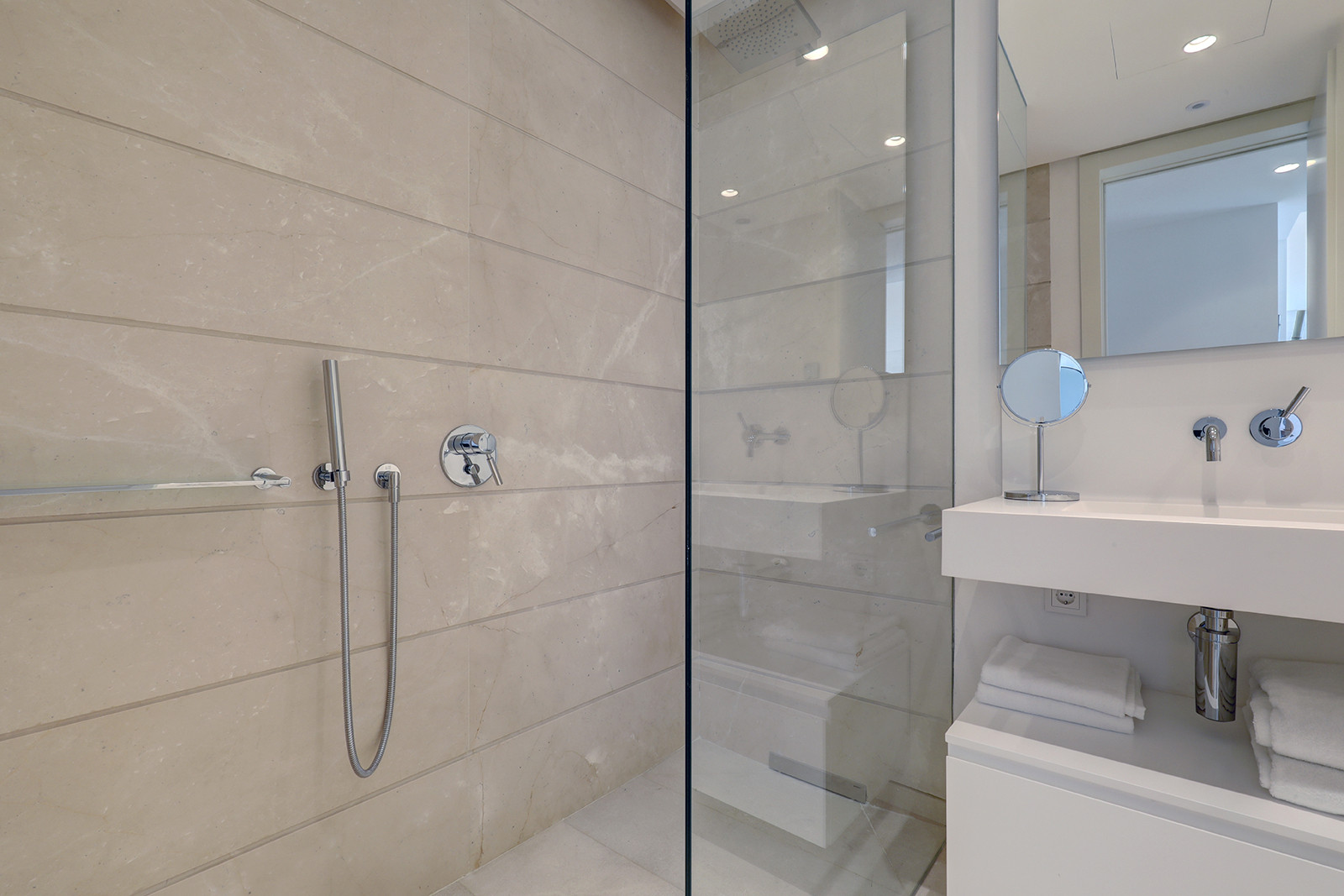 Los dos amplios dormitorios están elegantemente amueblados y equipados con cómodas camas. Los modernos cuartos de baño disponen de ducha de lluvia y calefacción por suelo radiante para mayor comodidad.