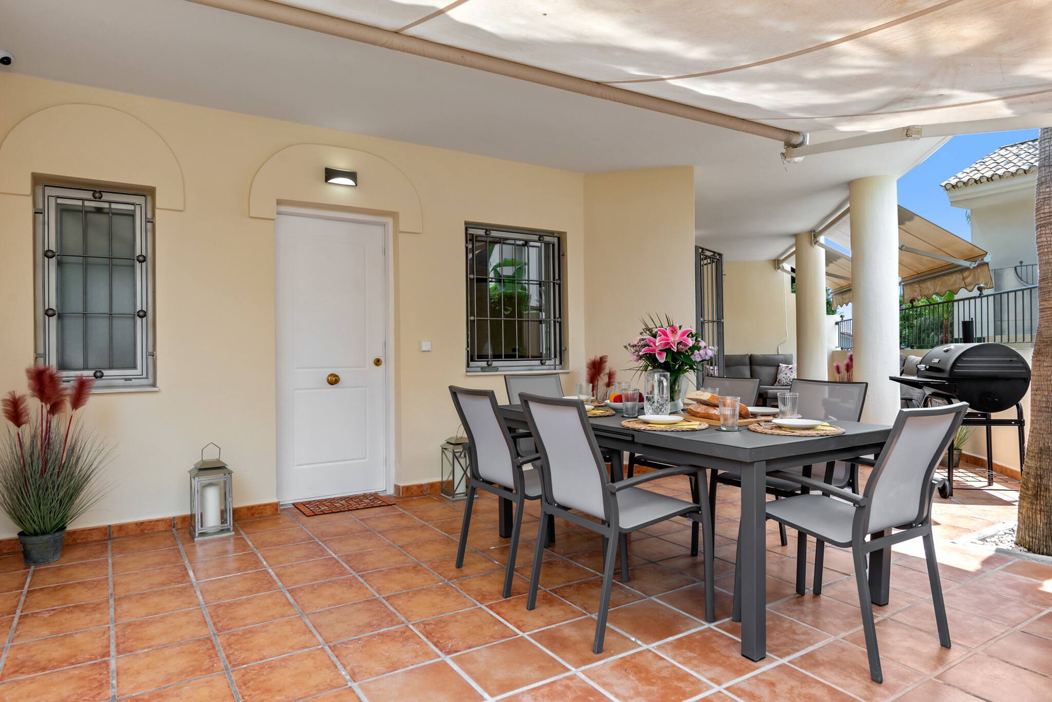 En el exterior, una gran terraza envolvente te invita a tomar el sol, disfrutar de una barbacoa y comer al aire libre. En la planta superior, dos terrazas más pequeñas ofrecen vistas parciales al mar. La piscina y el jardín comunitarios, rodeados de palmeras, proporcionan un entorno pintoresco para relajarte.