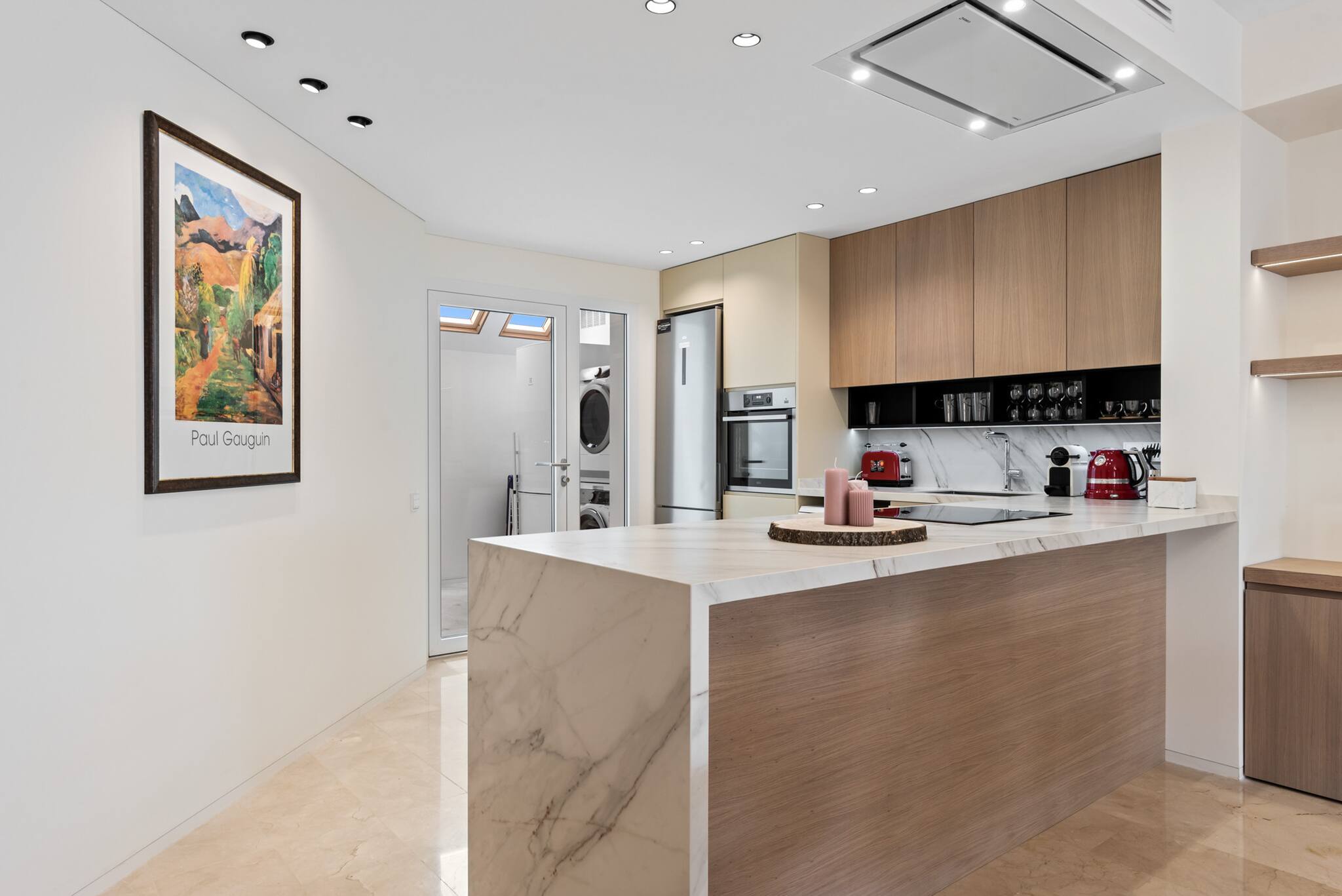 Al entrar, te recibe un diseño de planta abierta que integra la cocina, el comedor y el salón. El diseño moderno y la abundante luz natural crean un ambiente luminoso y acogedor en toda la propiedad. Para mayor comodidad, hay un lavadero equipado con lavadora/secadora y un frigorífico/congelador adicional.