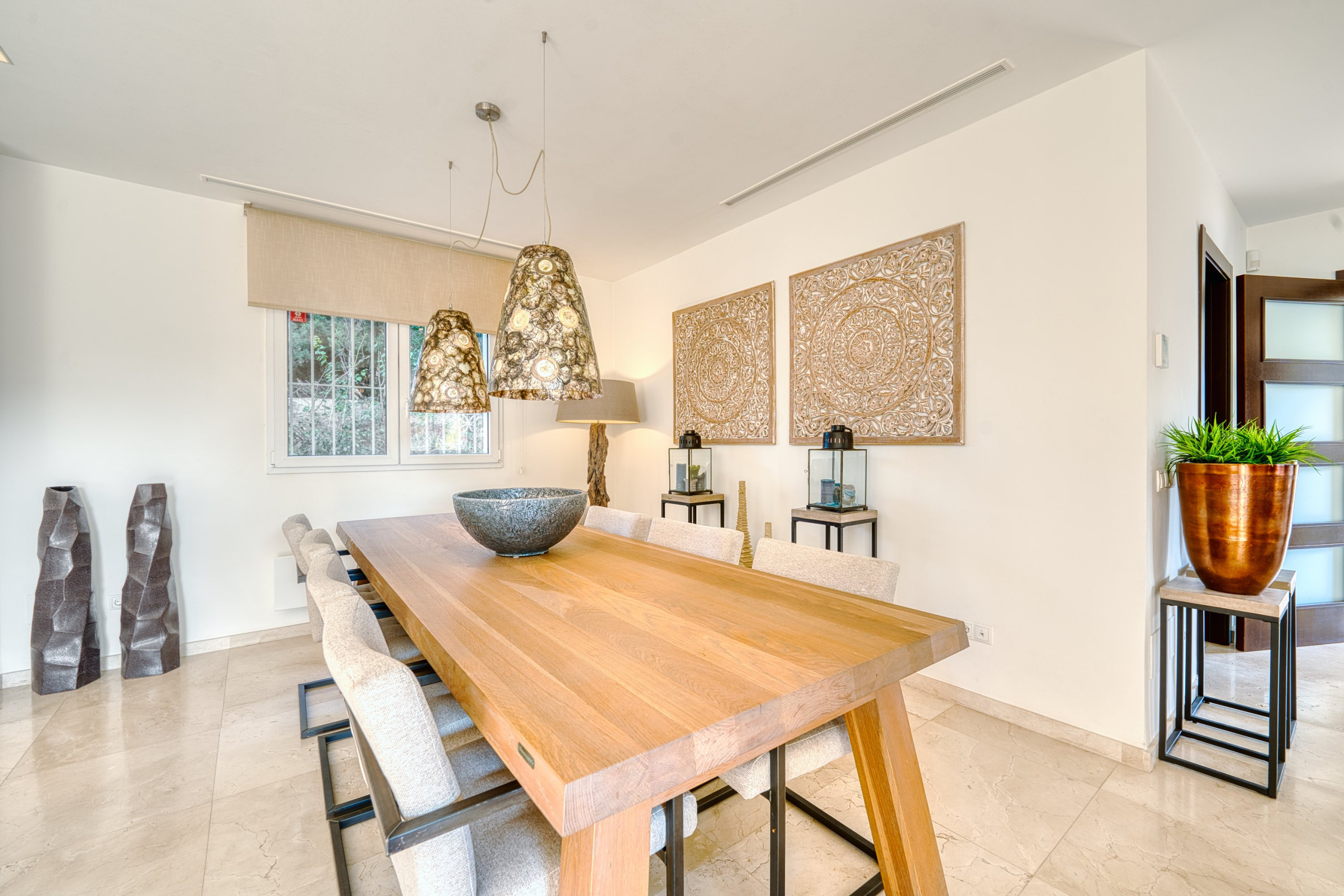 Al entrar por el jardín amurallado, bellamente cuidado y repleto de flores, los huéspedes son recibidos por un luminoso hall de entrada que conduce a una amplia sala de estar. Aquí, un acogedor sofá familiar en forma de L rodea un gran televisor y una acogedora chimenea, creando un ambiente cálido y acogedor. Junto a la sala de estar, una elegante mesa de comedor de estilo industrial con capacidad para ocho comensales complementa a la perfección la paleta de colores neutros de grises suaves de la villa y las obras de arte hechas a medida, incluidas las llamativas lámparas de madera y las lámparas colgantes de concha.