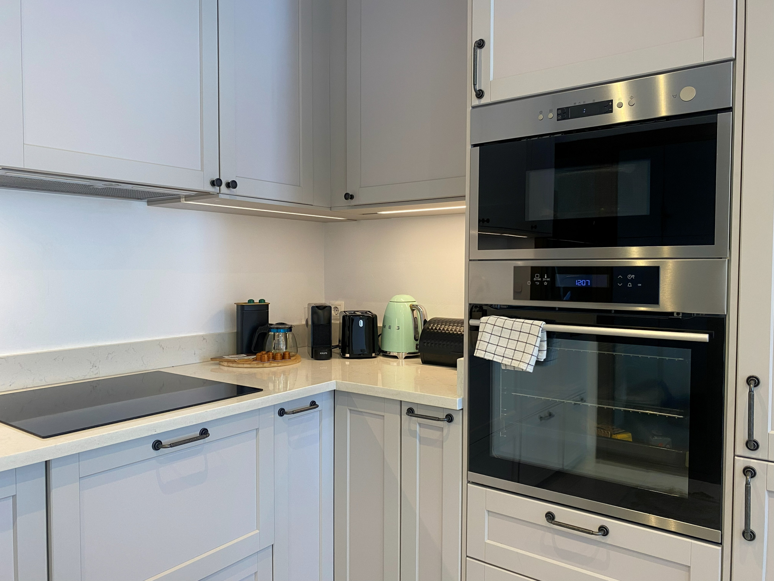 Une cuisine entièrement équipée avec lave-vaisselle, four, micro-ondes, réfrigérateur et machine à laver