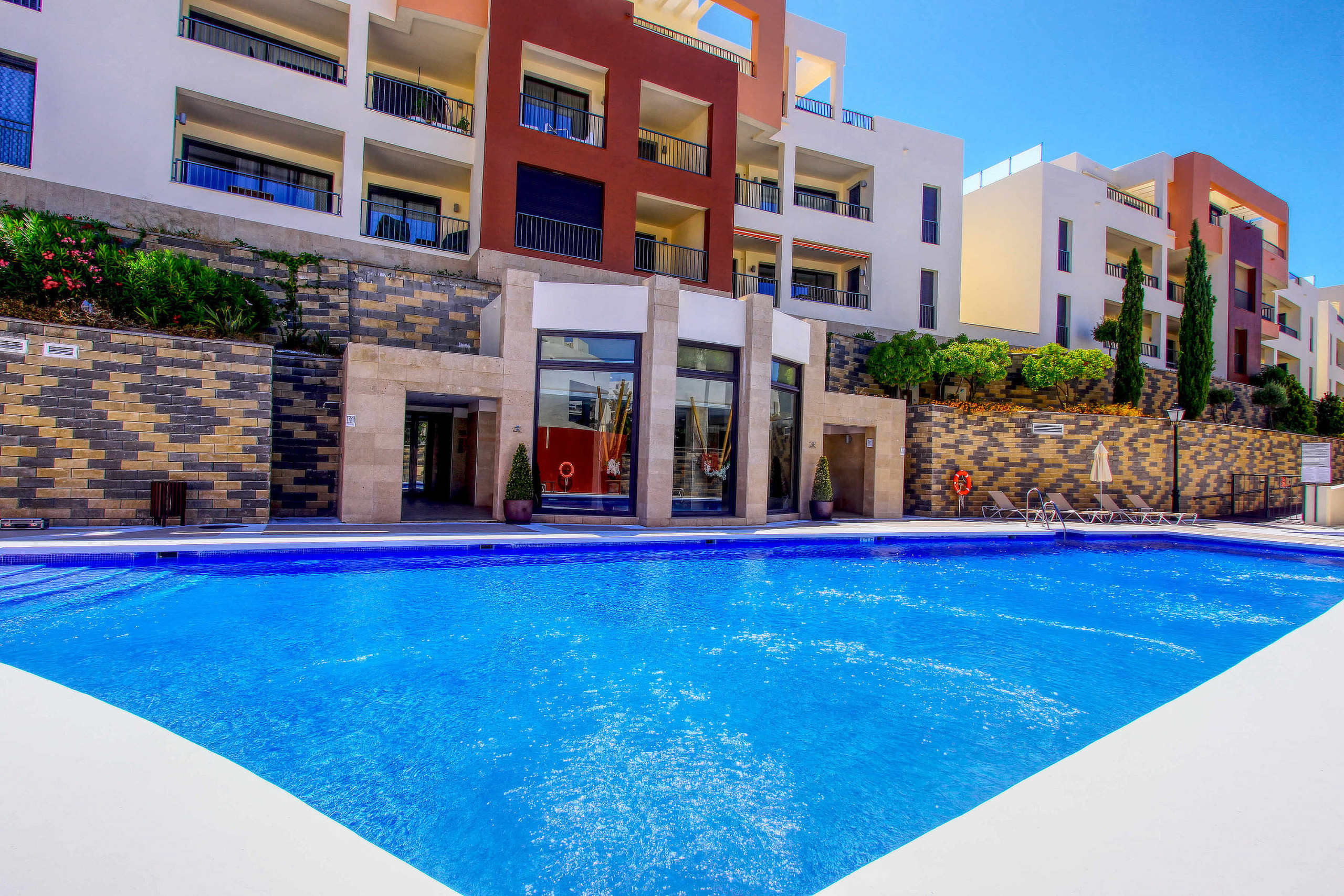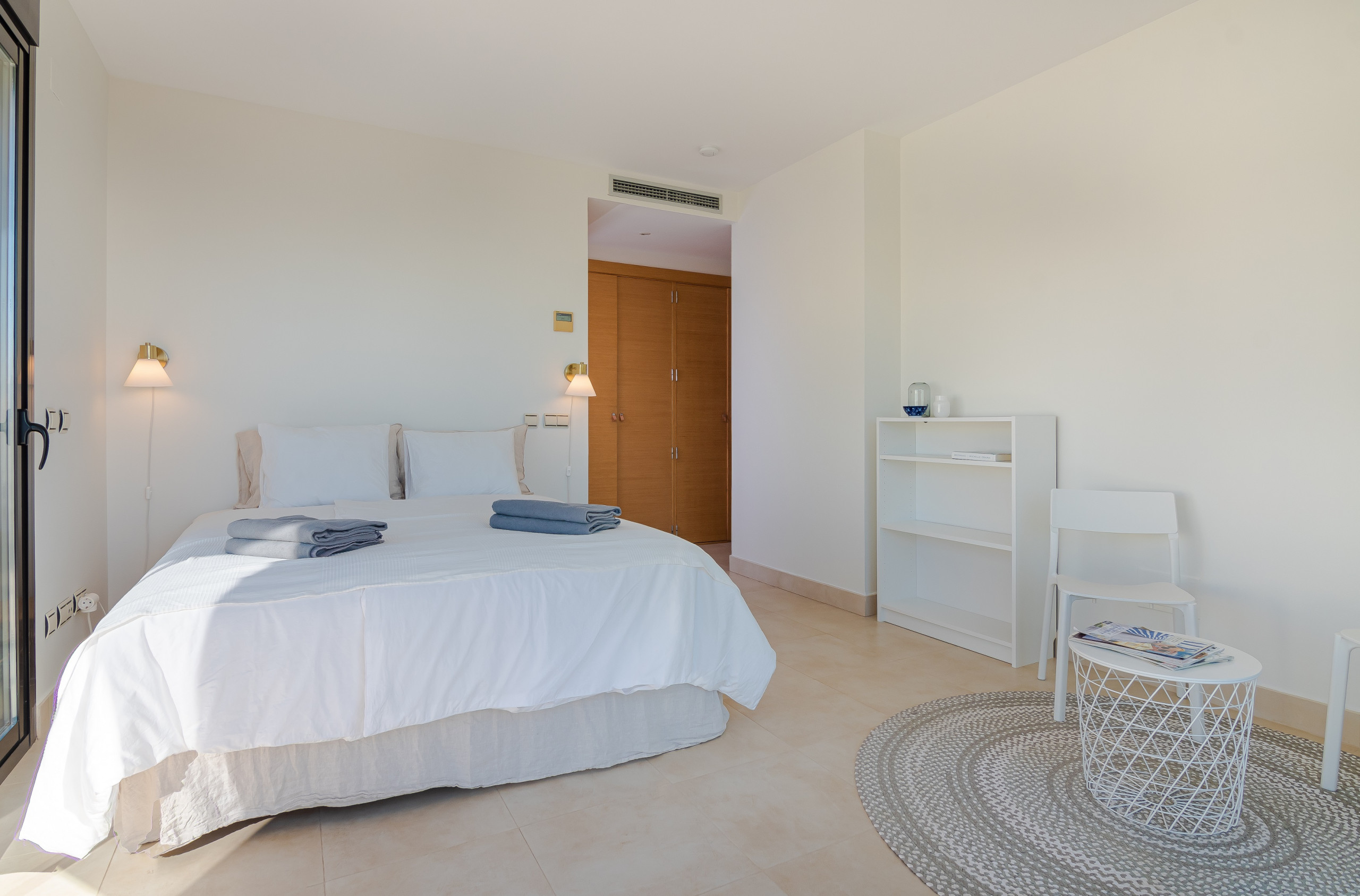La chambre principale a sa propre terrasse et sa propre salle de bain avec double vasque, douche, baignoire, WC et bidet et les 2 autres chambres ont une salle de bain à partager avec douche, simple vasque et WC. Toutes les chambres ont de grands placards intégrés. L'appartement est entièrement climatisé et Internet est fourni.