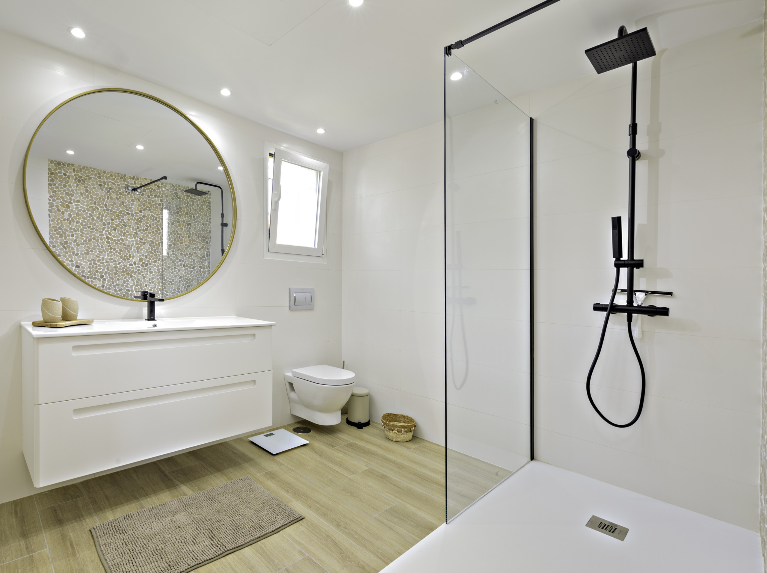 Upon entering the residence, you are welcomed into a bright, open-plan living space. To your left, the first bathroom is conveniently located, complete with a walk-in shower, toilet, and contemporary vanity unit. To your right, the spacious, modern kitchen awaits — fully equipped with premium appliances, including a refrigerator, freezer, oven, microwave, dishwasher, induction hob, coffee maker, kettle, blender, toaster, and a comprehensive selection of cookware and utensils, ideal for preparing anything from laid-back breakfasts to elegant dinners.