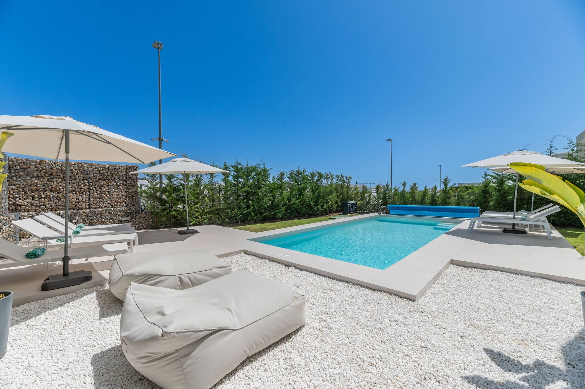 The kitchen is fully equipped with all desirable modern appliances and has drinkable tap water. Both the kitchen and living room are on the ground floor and have access to the private heated saltwater pool and landscaped garden. This level also includes a bedroom with en-suite bathroom and a guest toilet.